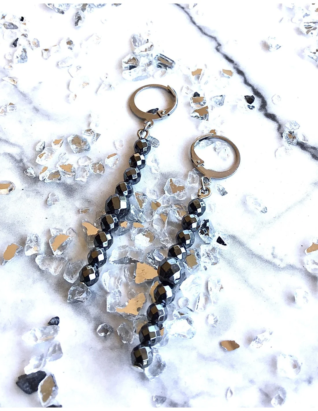 Αυτά τα χειροποίητα σκουλαρίκια με ημιπολύτιμες πέτρες αιματίτη σε ανθρακί μεταλλικό χρώμα αποπνέουν κομψότητα και μοναδικότητα. Οι πέτρες σε διάφορα μεγέθη δημιουργούν ένα εντυπωσιακό αποτέλεσμα, ενώ το ατσάλινο κούμπωμα χειροπέδα εξασφαλίζει άνεση και ασφάλεια. Ιδανικά για να προσθέσουν μια μοντέρνα πινελιά σε κάθε σας εμφάνιση.