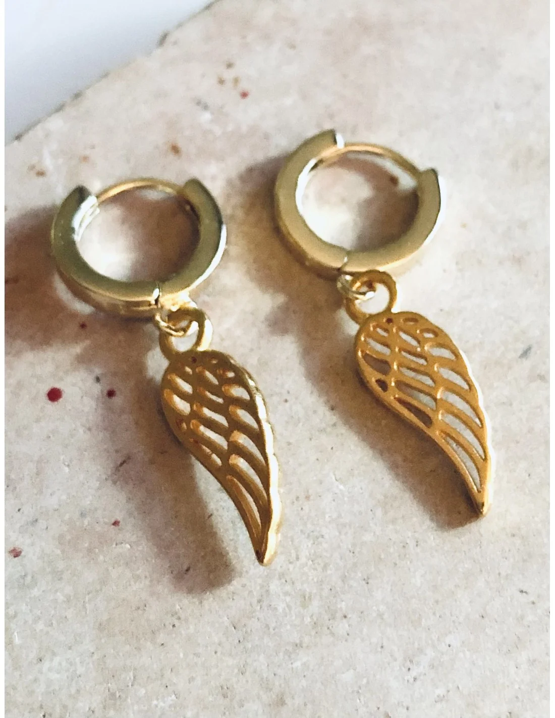 Αυτά τα χειροποίητα σκουλαρίκια ξεχωρίζουν με το διάτρητο σχέδιο φτερού από επιχρυσωμένο ορείχαλκο, δεμένο σε κρίκο από ανθεκτικό επιχρυσωμένο ανοξείδωτο ατσάλι. Ιδανικά για όσες λατρεύουν τα φυσικά μοτίβα και θέλουν να προσθέσουν μια διακριτική αλλά κομψή πινελιά στην εμφάνισή τους.