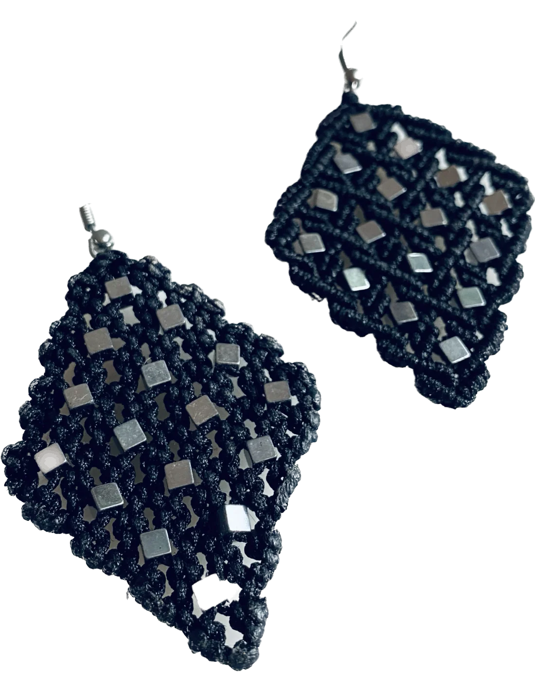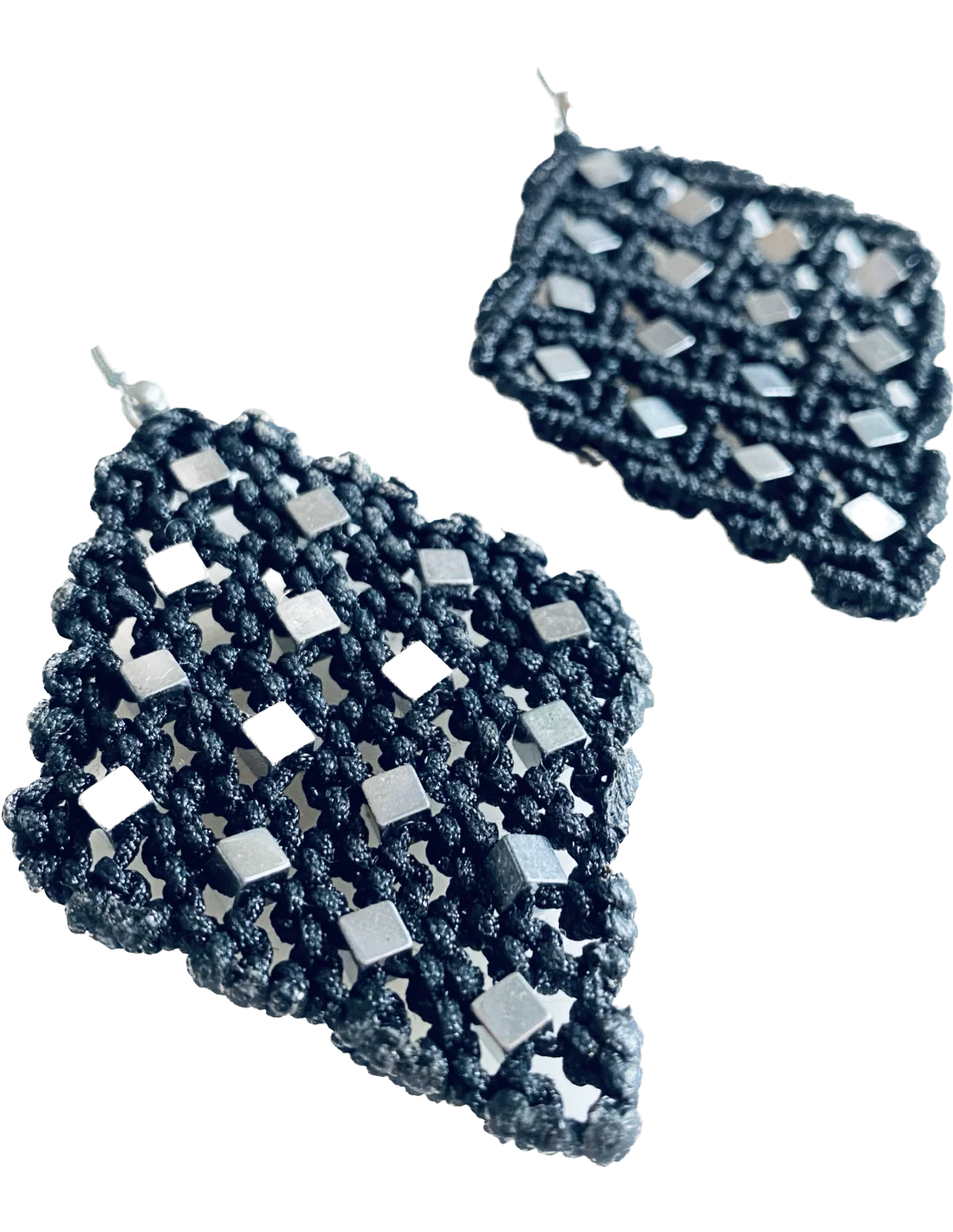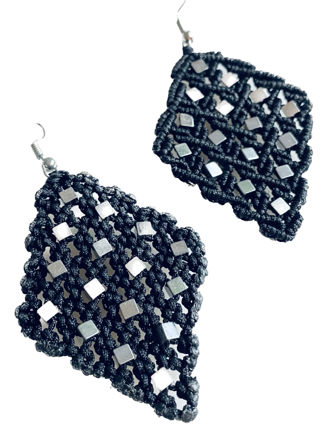 Εντυπωσιάστε με τα χειροποίητα σκουλαρίκια μακραμέ πλεγμένα στο χέρι σε μοναδικό σχήμα ρόμβου και μαύρη απόχρωση. Το διάτρητο σχέδιο αναδεικνύει τις κομψές ημιπολύτιμες πέτρες Αιματίτη σε σχήμα κύβου, με ασημί απόχρωση που προσθέτει λάμψη και εκλεπτυσμένη αισθητική. Ιδανικά για να προσδώσουν έναν αέρα κομψότητας και στιλ σε κάθε σας εμφάνιση, αυτά τα σκουλαρίκια μακραμέ συνδυάζουν την παράδοση με τη μοντέρνα αισθητική.