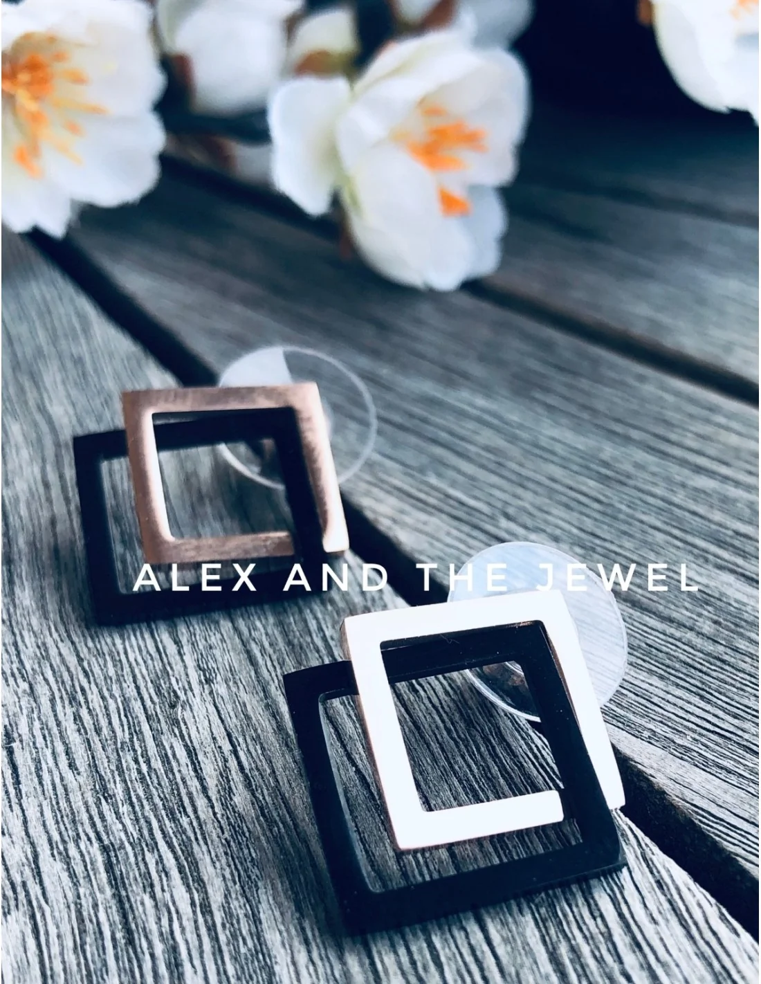 Δώστε έναν μοντέρνο και εντυπωσιακό τόνο στις εμφανίσεις σας με τα χειροποίητα σκουλαρίκια Hypatia. Κατασκευασμένα από ατσάλι, διαθέτουν τετράγωνα στοιχεία σε κομψό χρυσό και μαύρο συνδυασμό, ενώ το κούμπωμα καρφί εξασφαλίζει άνεση και σταθερότητα.