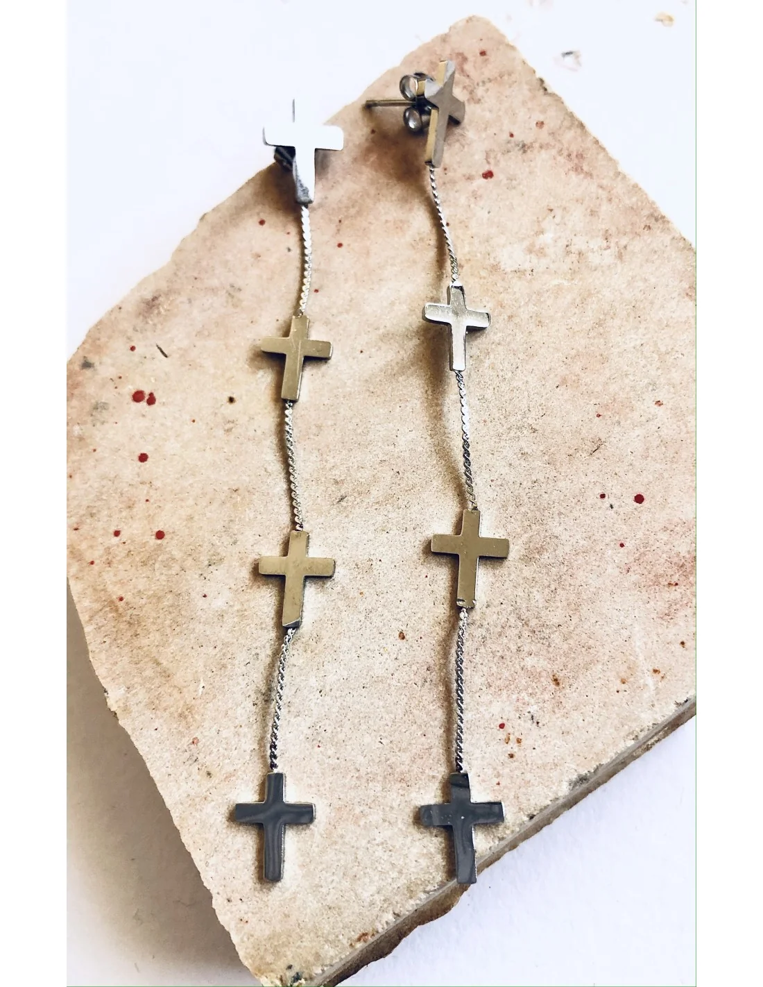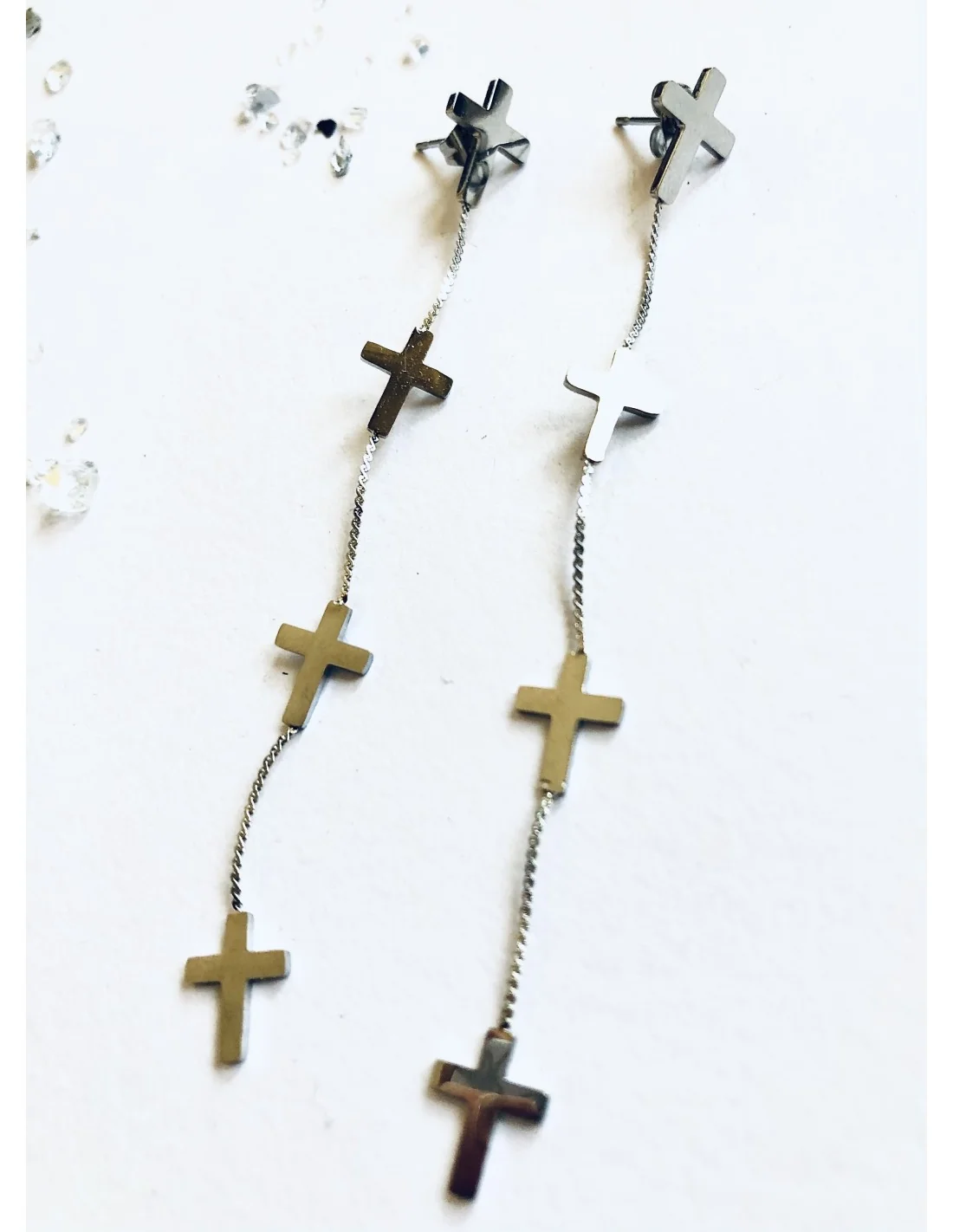 Κρεμαστά σκουλαρίκια από ατσάλινη αλυσίδα και πλακέ σταυρουδάκια.