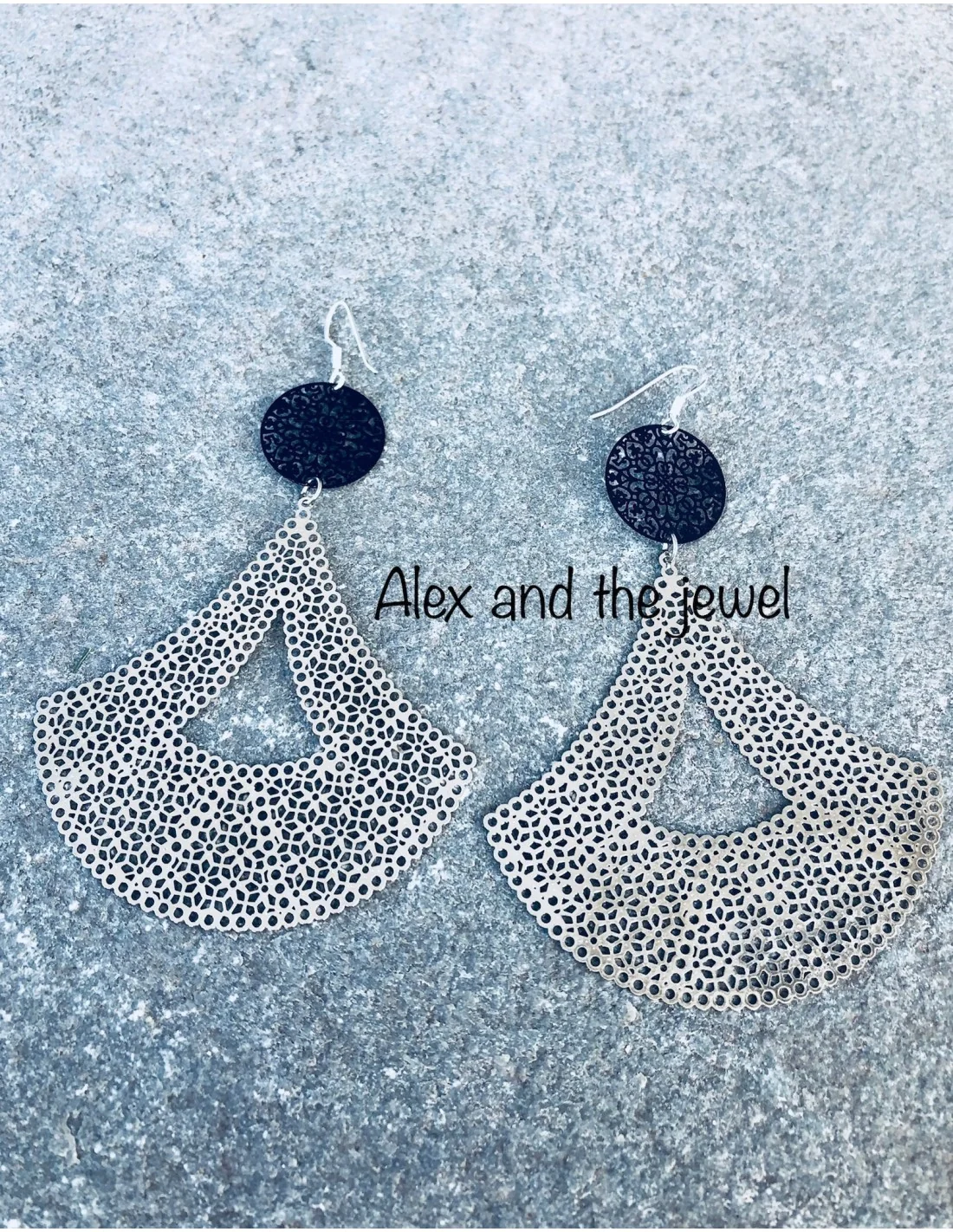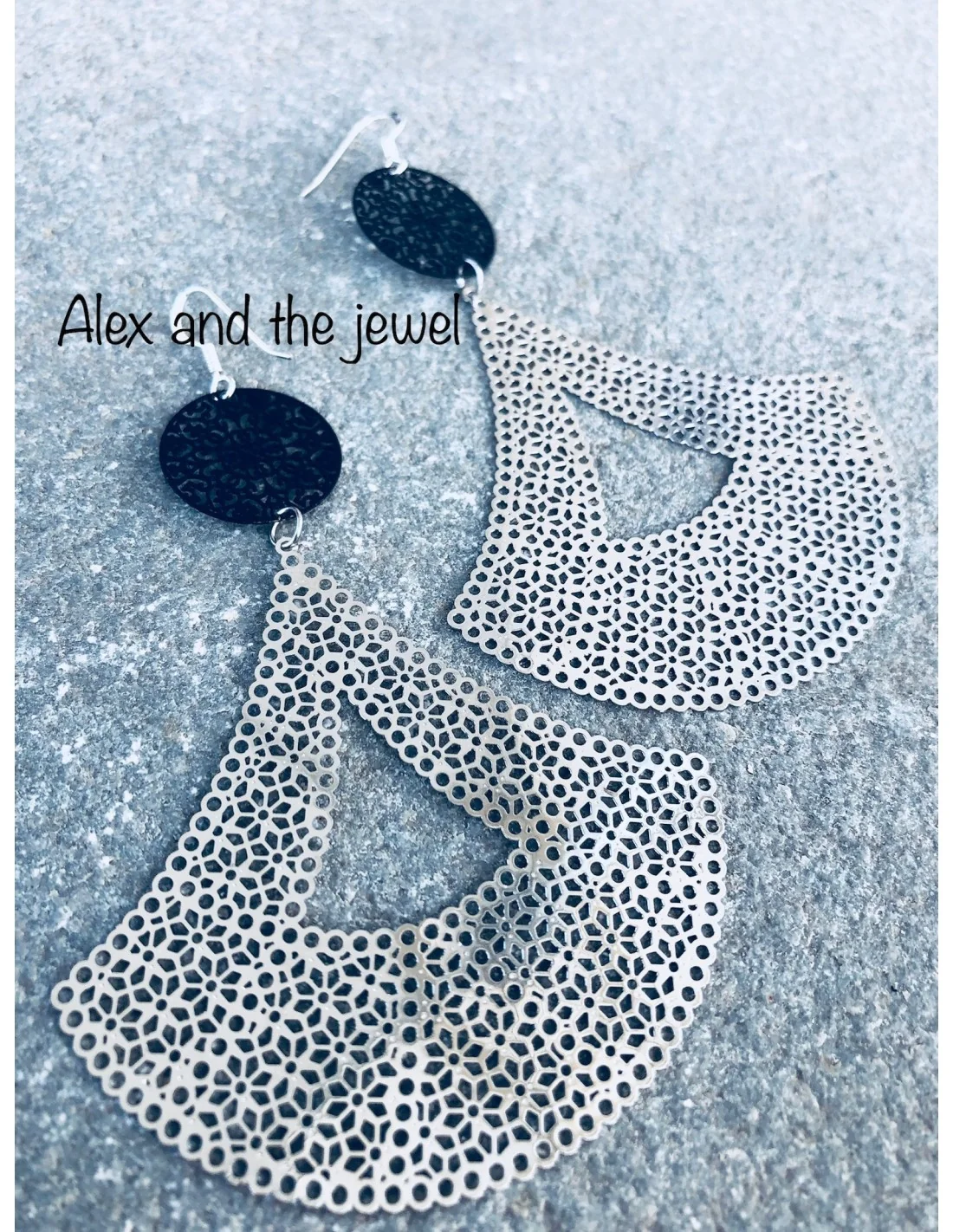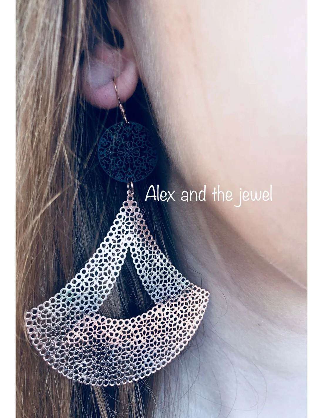 Δεν υπάρχουν άλλα προϊόντα στο καλάθι σαςΚόσμημα σκουλαρίκια σε ροζ χρυσό ή ασημί χρώμα, συνδυασμένο με μαύρο φιλιγκρί Swings