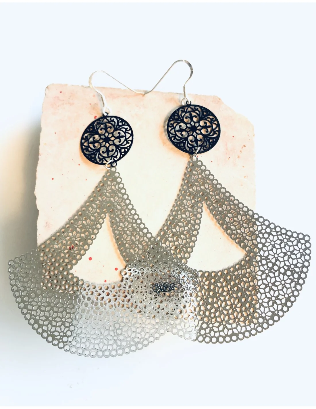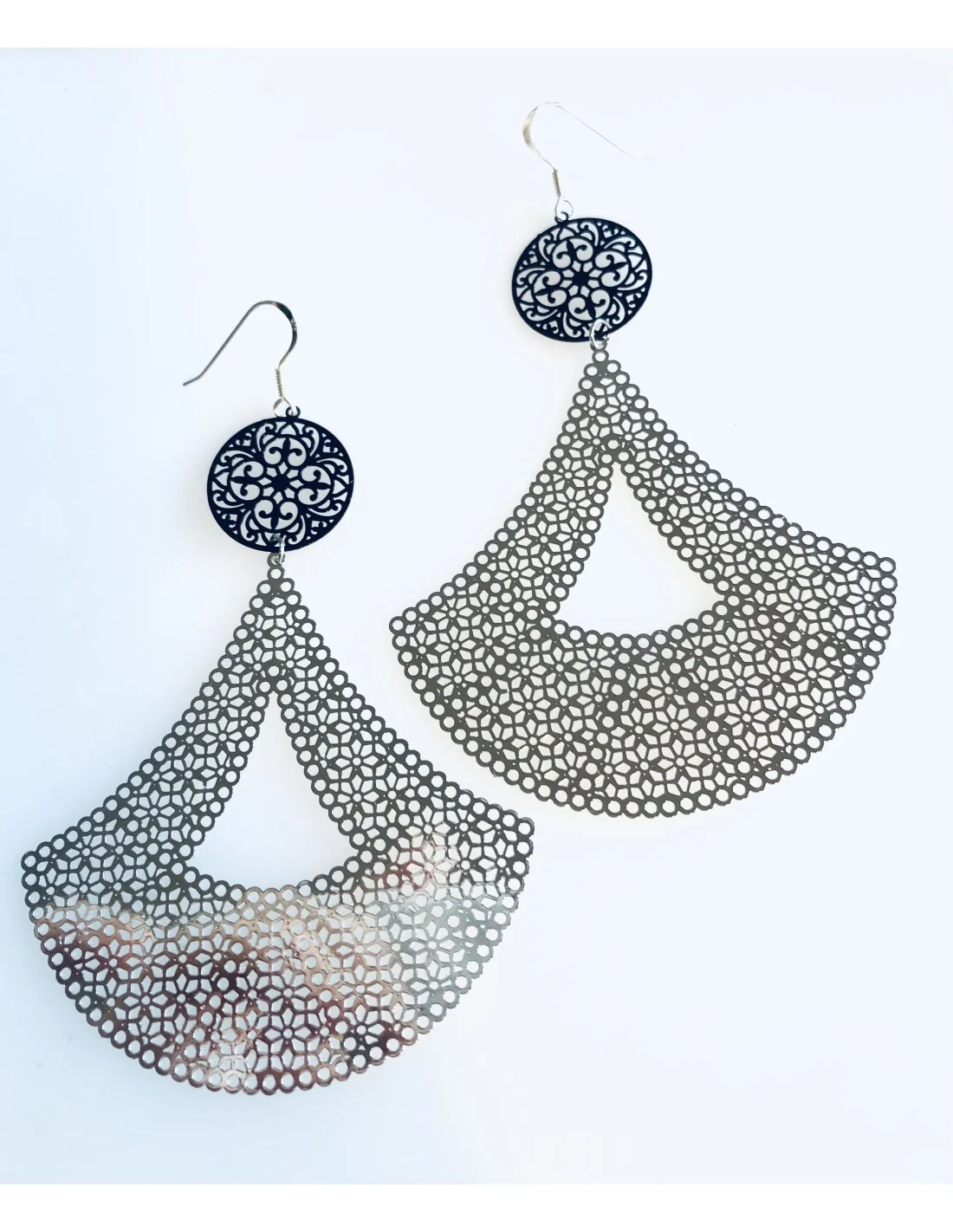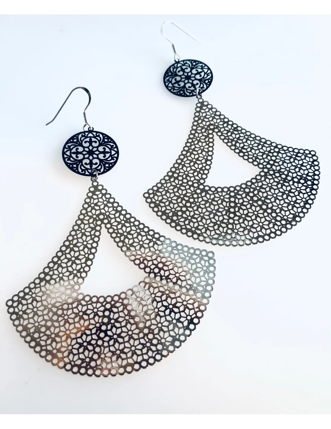 Δεν υπάρχουν άλλα προϊόντα στο καλάθι σαςΚόσμημα σκουλαρίκια σε ροζ χρυσό ή ασημί χρώμα, συνδυασμένο με μαύρο φιλιγκρί Swings