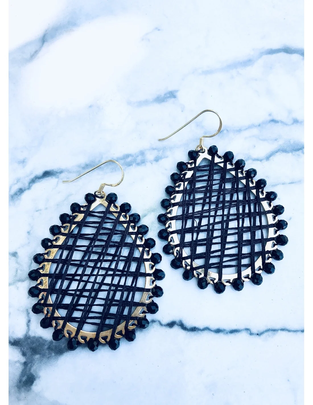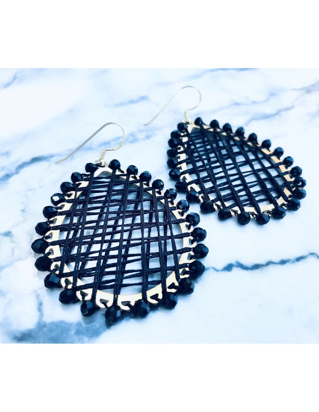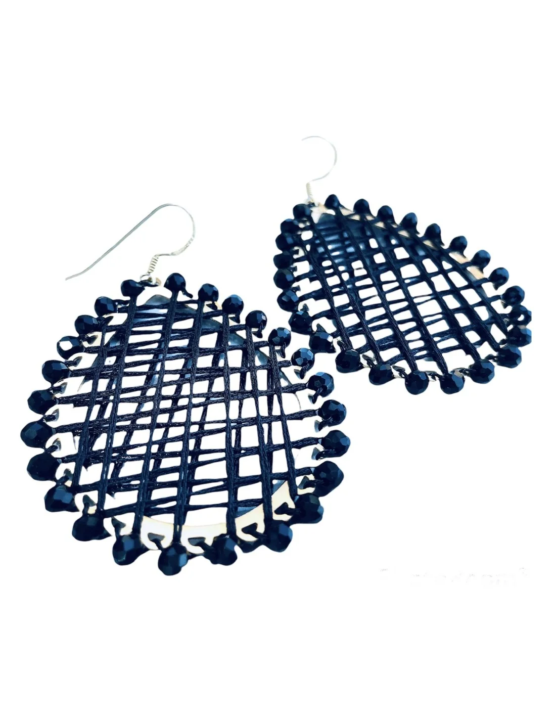 Αυτά τα χειροποίητα σκουλαρίκια διαθέτουν οβάλ στοιχείο, πλεγμένο με μαύρη κλωστή, ενώ τα μαύρα κρύσταλλα περιμετρικά τους προσφέρουν μια αίσθηση πολυτέλειας και λάμψης. Ο συνδυασμός της μοντέρνας πλέξης με την κομψότητα των κρυστάλλων κάνει αυτά τα σκουλαρίκια ιδανικά για μία εντυπωσιακή εμφάνιση που δεν περνά απαρατήρητη.