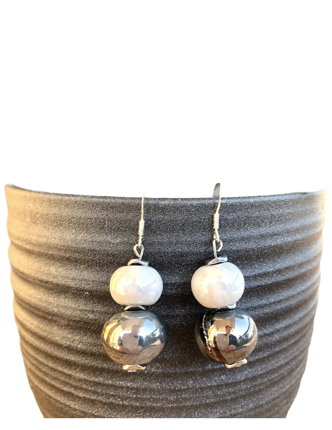 Τα χειροποίητα σκουλαρίκια Amorgos είναι μια μοναδική δημιουργία που συνδυάζει την κομψότητα των μεγάλων σφαιρικών κεραμικών πετρών σε λευκό και ανθρακί με την ανθεκτικότητα των ατσάλινων διακοσμητικών μπιλιών. Οι γάντζοι από ασήμι 925 προσθέτουν μια διακριτική λάμψη, καθιστώντας τα ιδανικά για κάθε περίσταση.