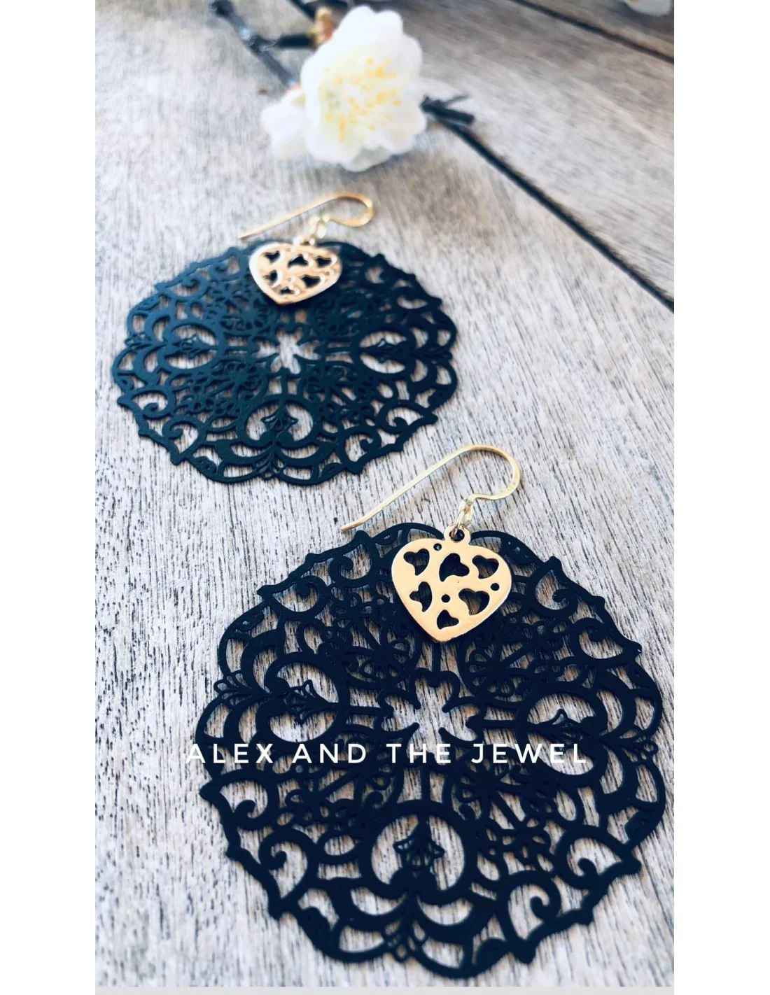 Κόσμημα σκουλαρίκια με μαύρο περίτεχνο στοιχείο φιλιγκρί και ατσάλινη διάτρητη καρδούλα Anais
