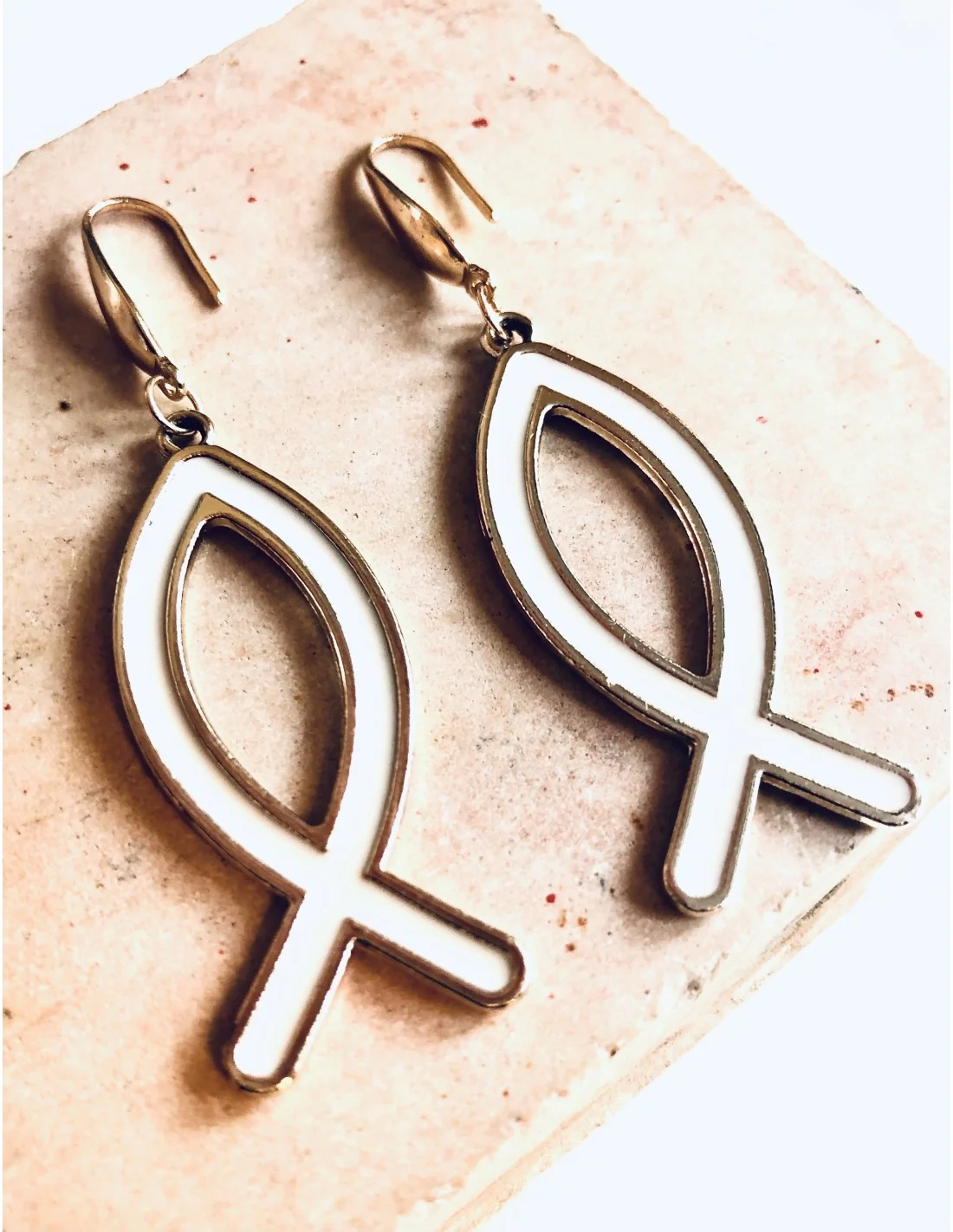 Τα σκουλαρίκια "Lorin" είναι κομψά και παιχνιδιάρικα, κατασκευασμένα από επιχρυσωμένο ορείχαλκο με λεπτομέρειες από λευκό σμάλτο σε ένα ιδιαίτερο σχήμα ψαριού. Οι περίτεχνοι γάντζοι από επιχρυσωμένο ανοξείδωτο ατσάλι προσθέτουν μία έξτρα νότα πολυτέλειας, κάνοντας αυτά τα σκουλαρίκια ιδανικά για boho-chic εμφανίσεις με φινέτσα.