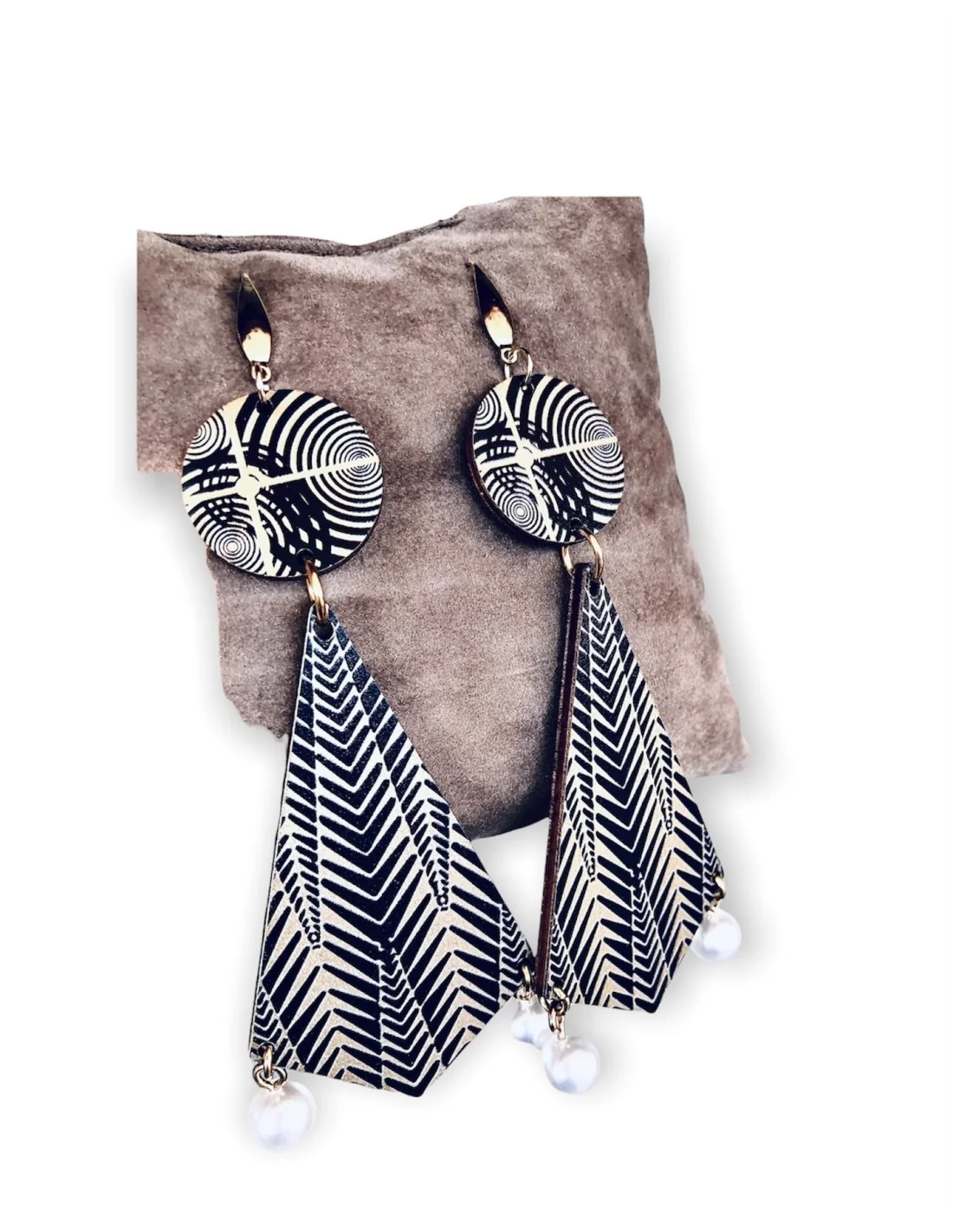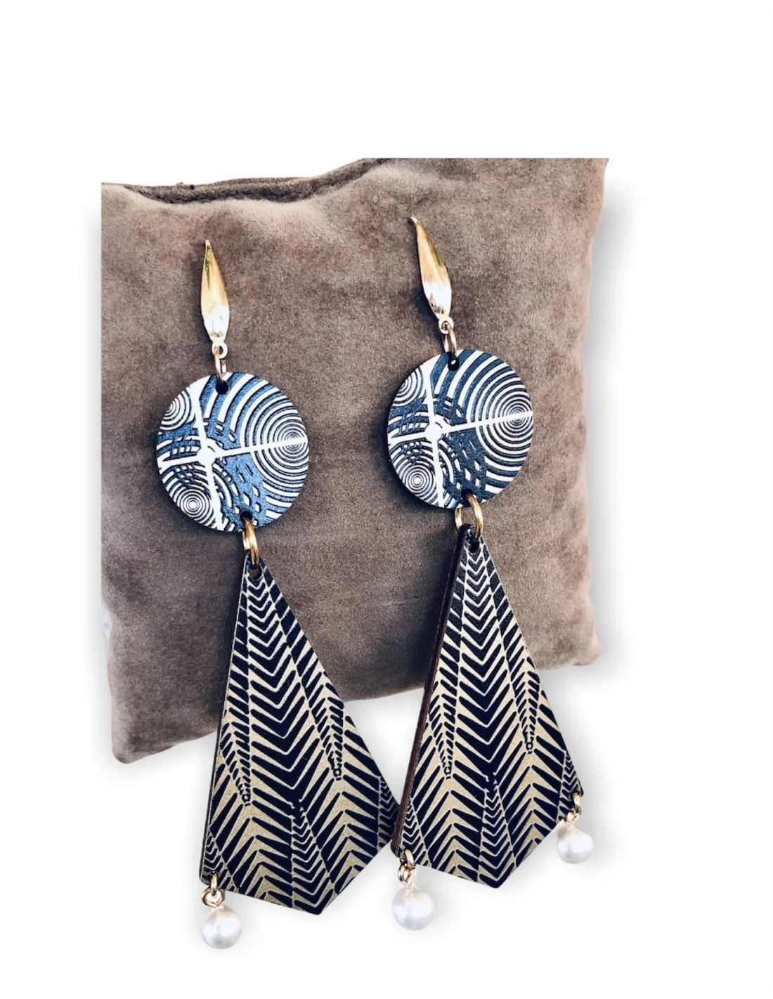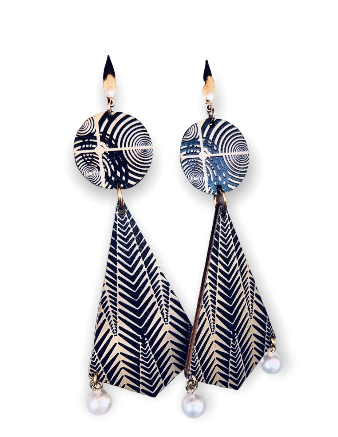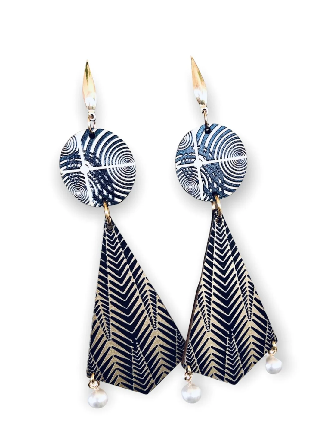 Αυτά τα χειροποίητα κρεμαστά σκουλαρίκια με ξύλινα στοιχεία σε συνδυασμό χρυσού και μαύρου, κρεμαστές διακοσμητικές πέρλες και περίτεχνους επιχρυσωμένους γάντζους από ατσάλι προσδίδουν μία εξωτική και κομψή εμφάνιση. Ο πρωτότυπος σχεδιασμός τους αναδεικνύει τη φυσική ομορφιά των υλικών και ταιριάζει απόλυτα σε γυναίκες που αγαπούν το ethnic και statement στυλ.