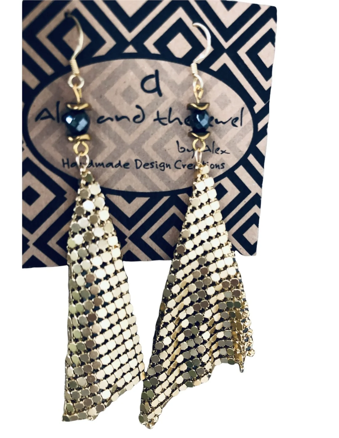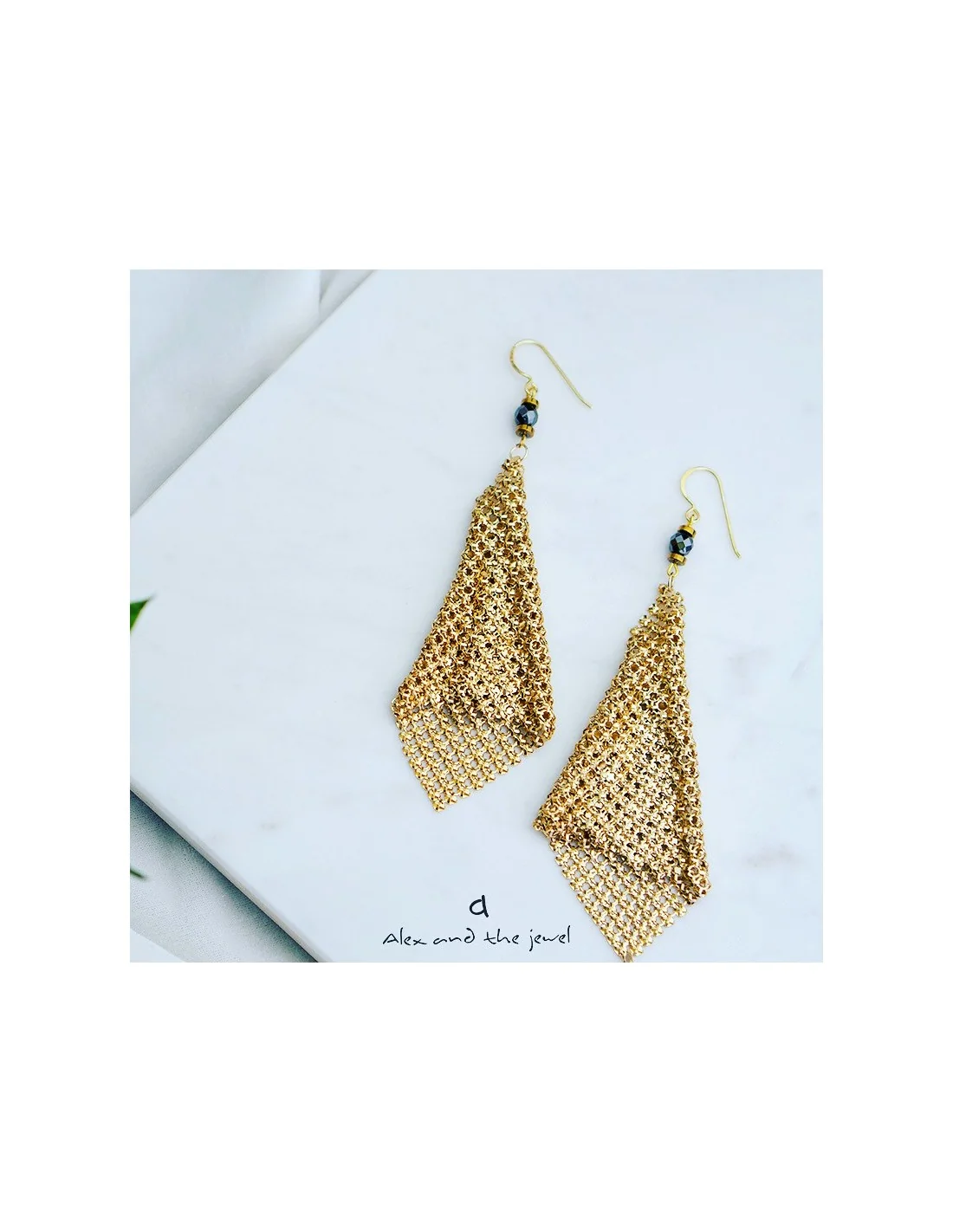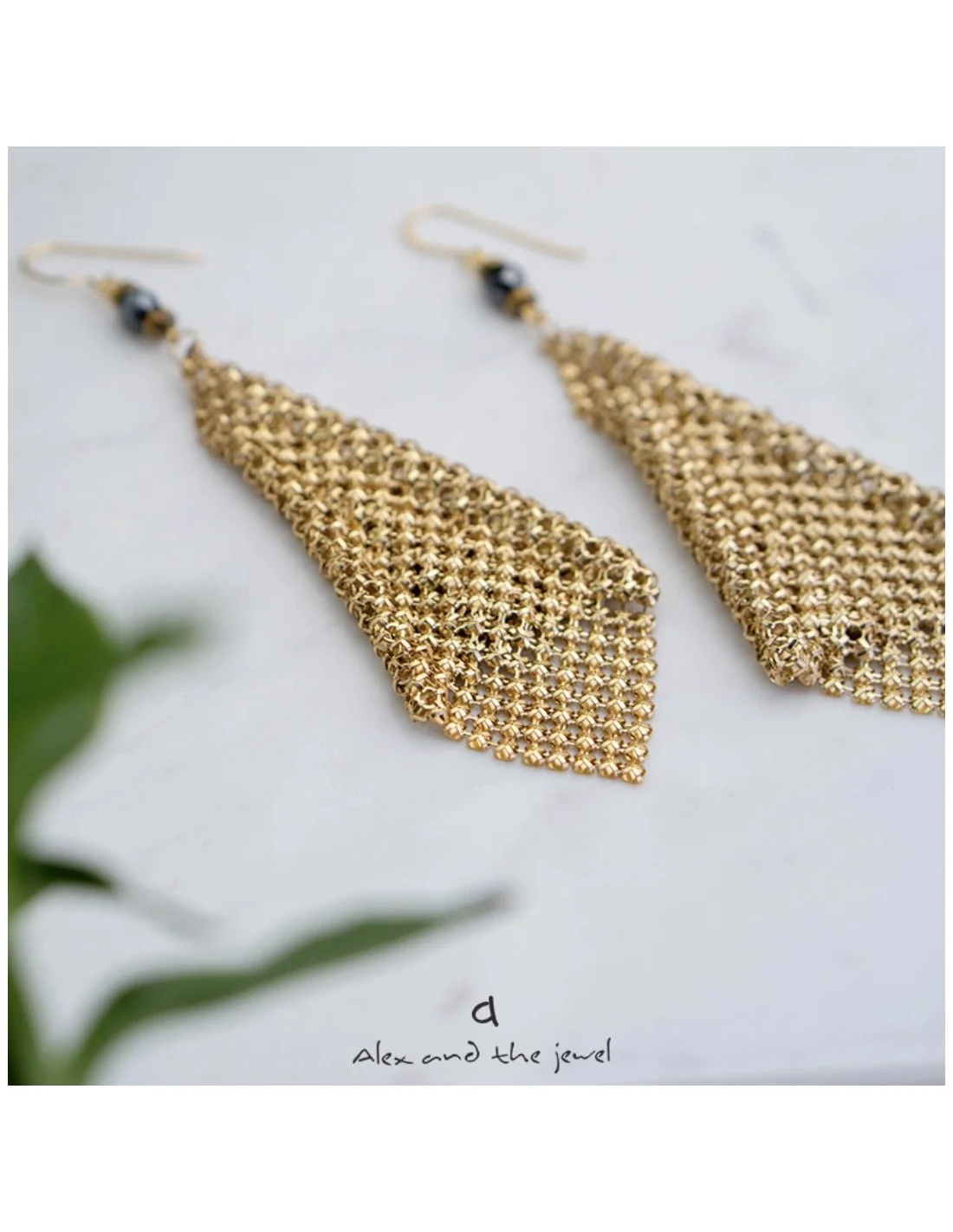 Χειροποίητα γυναικεία σκουλαρίκια από πλέγμα σε χρυσό χρώμα, δεμένο με ημιπολύτιμες πέτρες αιματίτη σε ανθρακί και χρυσό χρώμα.