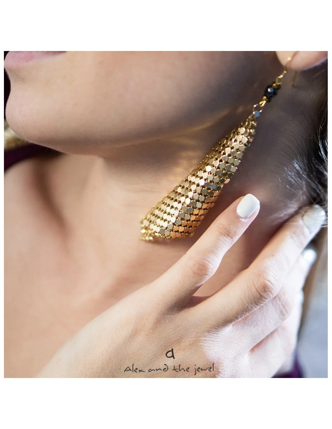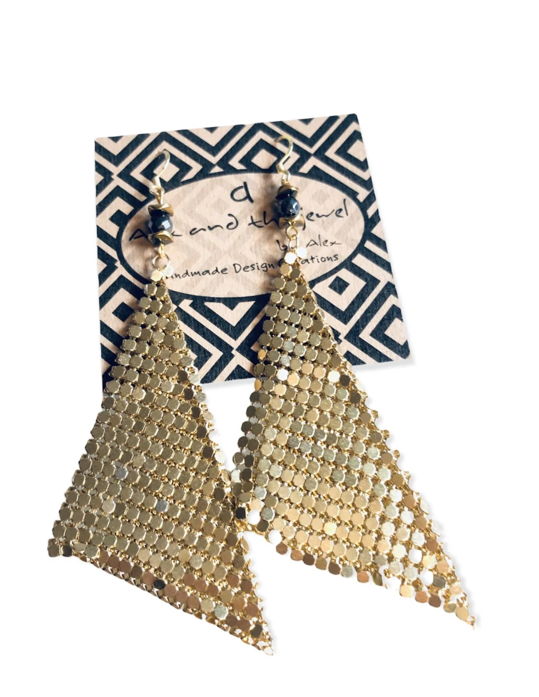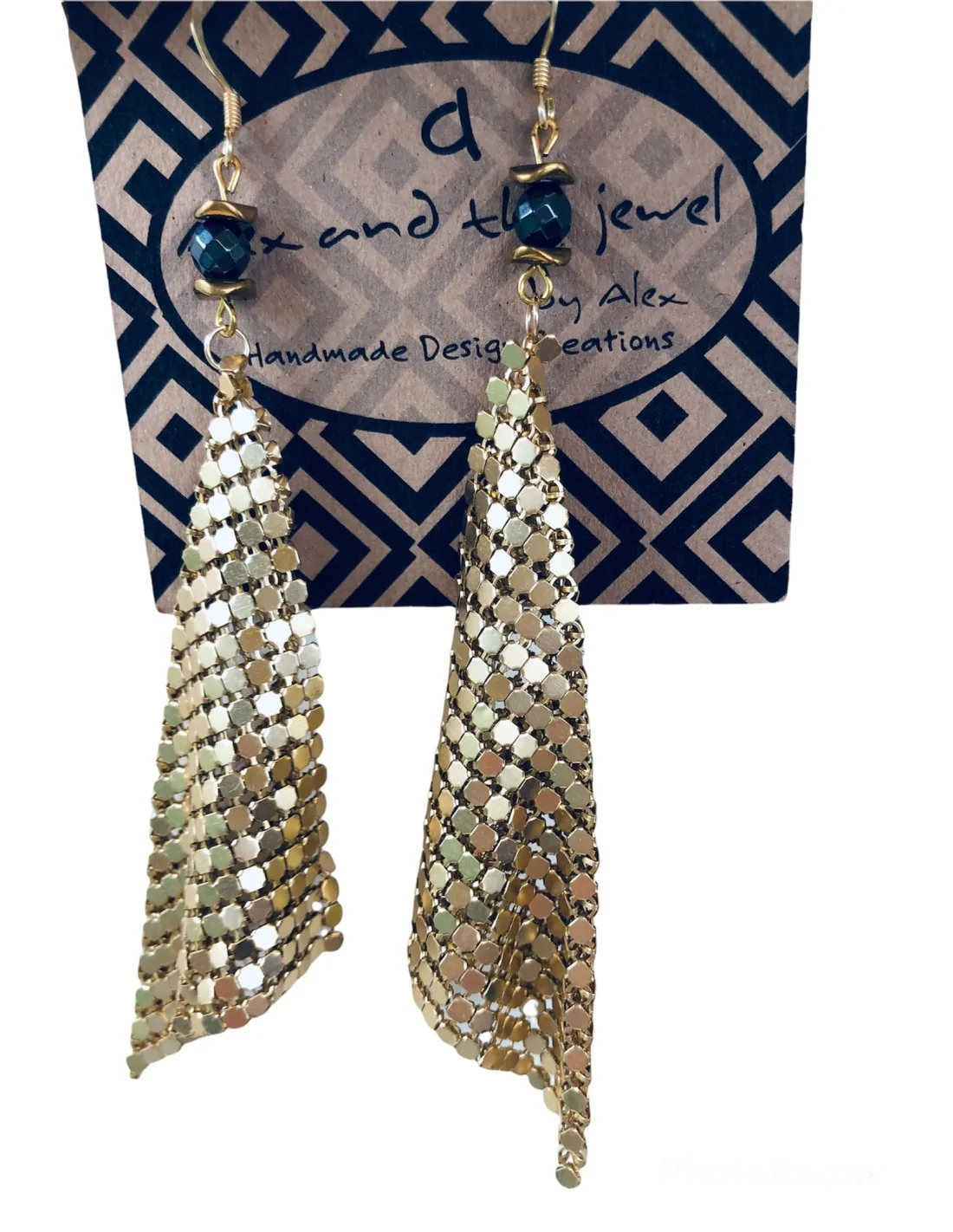 Χειροποίητα γυναικεία σκουλαρίκια από πλέγμα σε χρυσό χρώμα, δεμένο με ημιπολύτιμες πέτρες αιματίτη σε ανθρακί και χρυσό χρώμα.