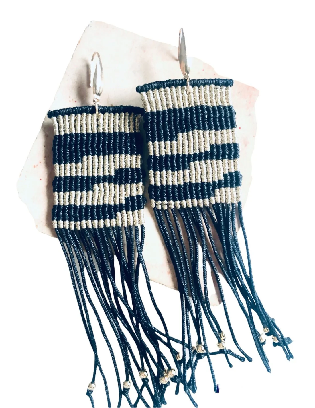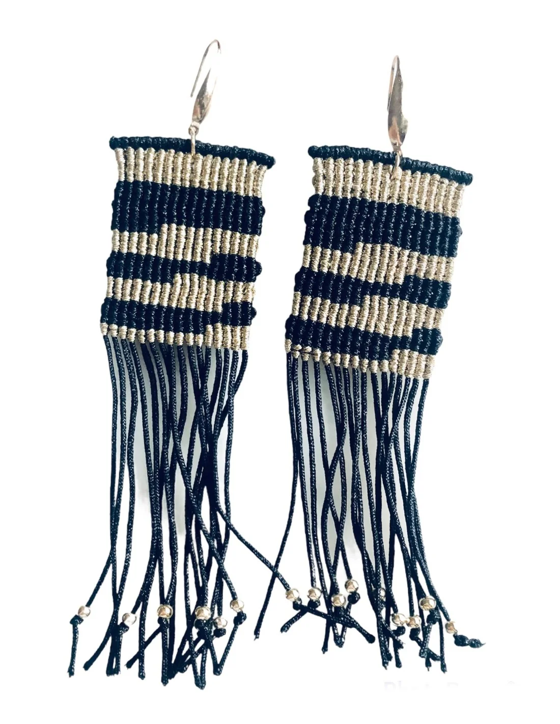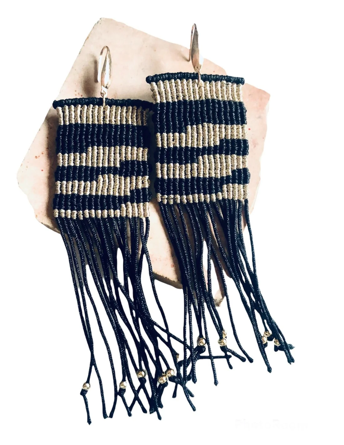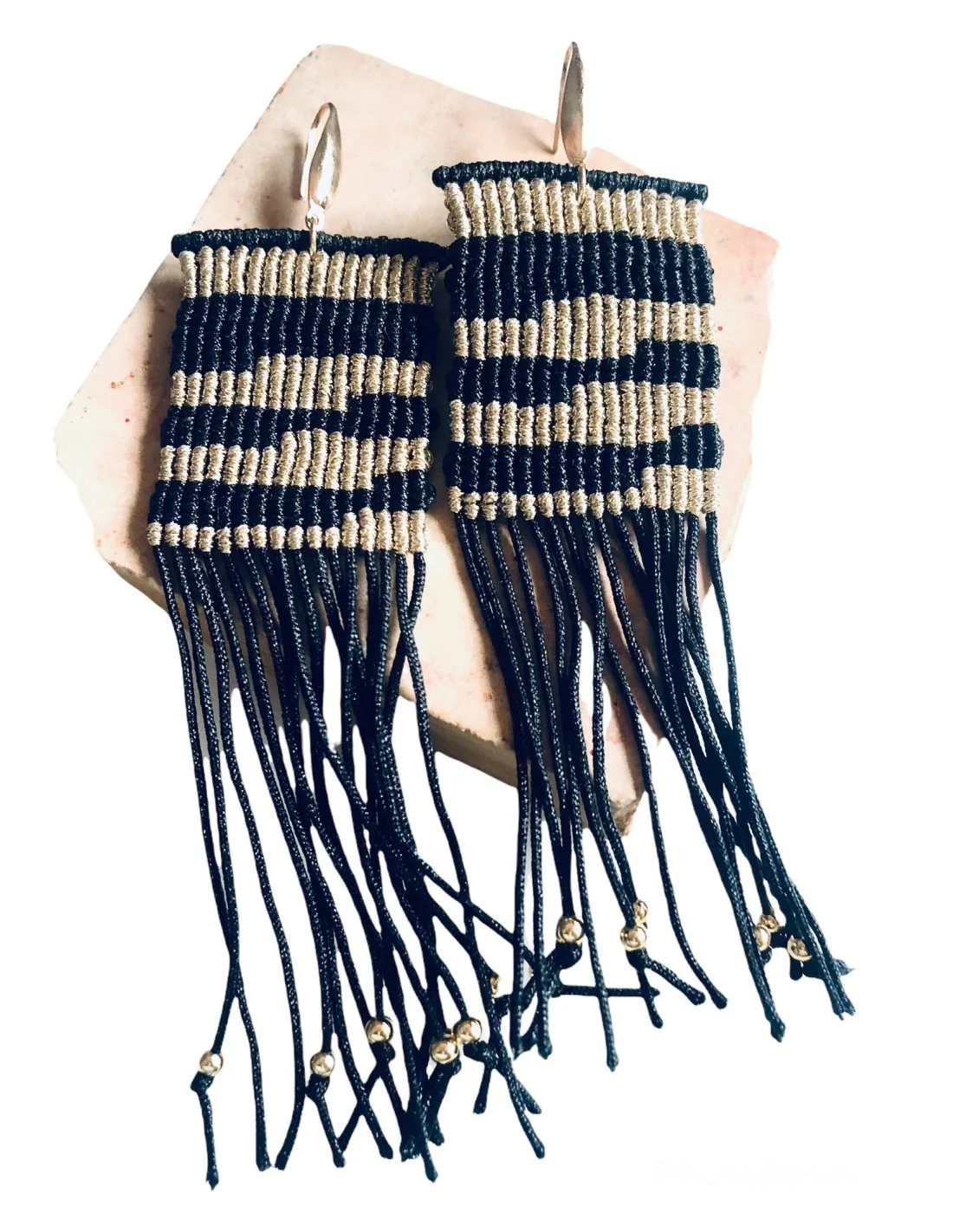 Αυτά τα χειροποίητα σκουλαρίκια είναι πλεγμένα στο χέρι με πλέξη μακραμέ σε εκλεπτυσμένους χρωματικούς συνδυασμούς χρυσού και μαύρου. Το περίτεχνο boho σχέδιο τους προσδίδει μια μοναδική και εναλλακτική αισθητική, ενώ οι επιχρυσωμένοι γάντζοι από ανοξείδωτο ατσάλι προσφέρουν άνεση και αντοχή. Ιδανικά για γυναίκες που αγαπούν το ethnic και boho στυλ.